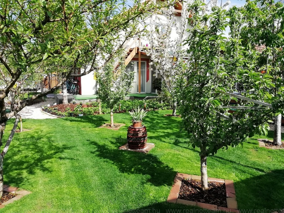 Az öntöző rendszerrel ellátott, gondosan megtervezett, parkosított telek gyönyörű pázsittal, termő gyümölcsfákkal, eperrel, szederrel, málnával, szőlővel beültetve, melynek locsolásáról fúrt kút gondoskodik.