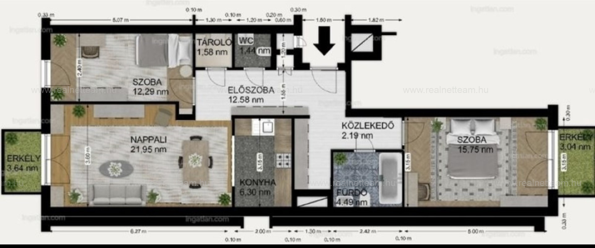 - Amerikai konyhás nappali + 2 külön nyíló hálószoba