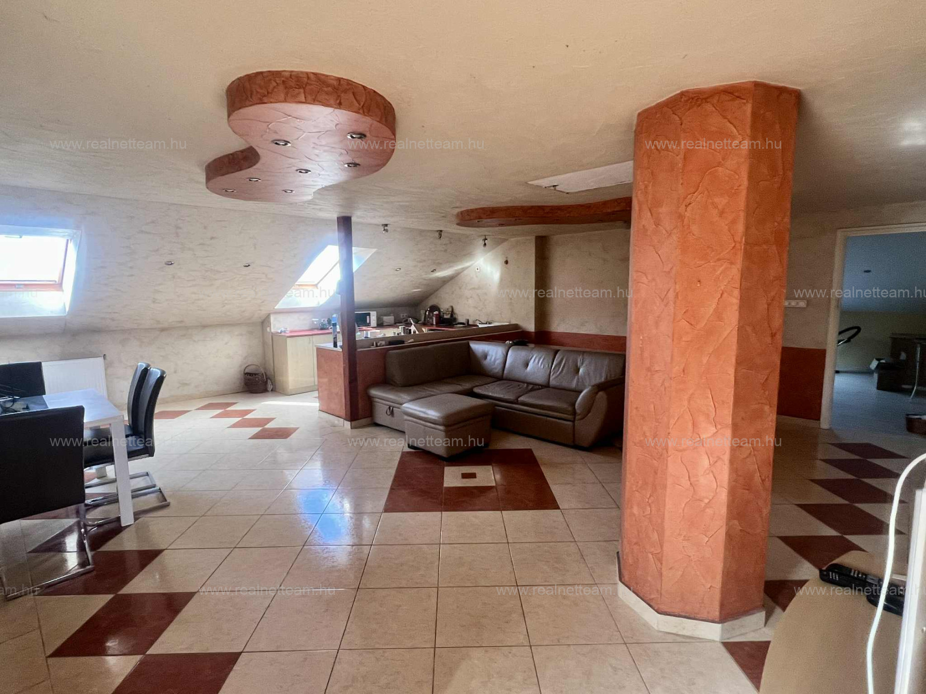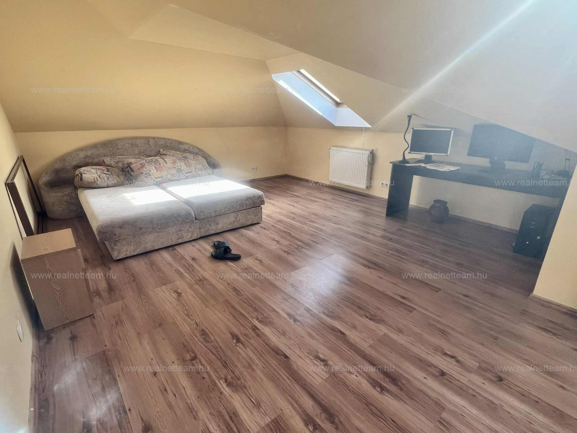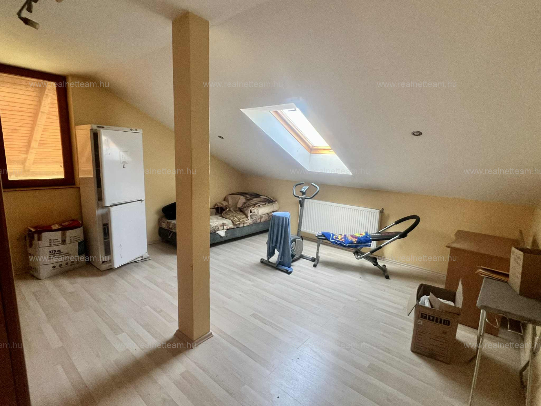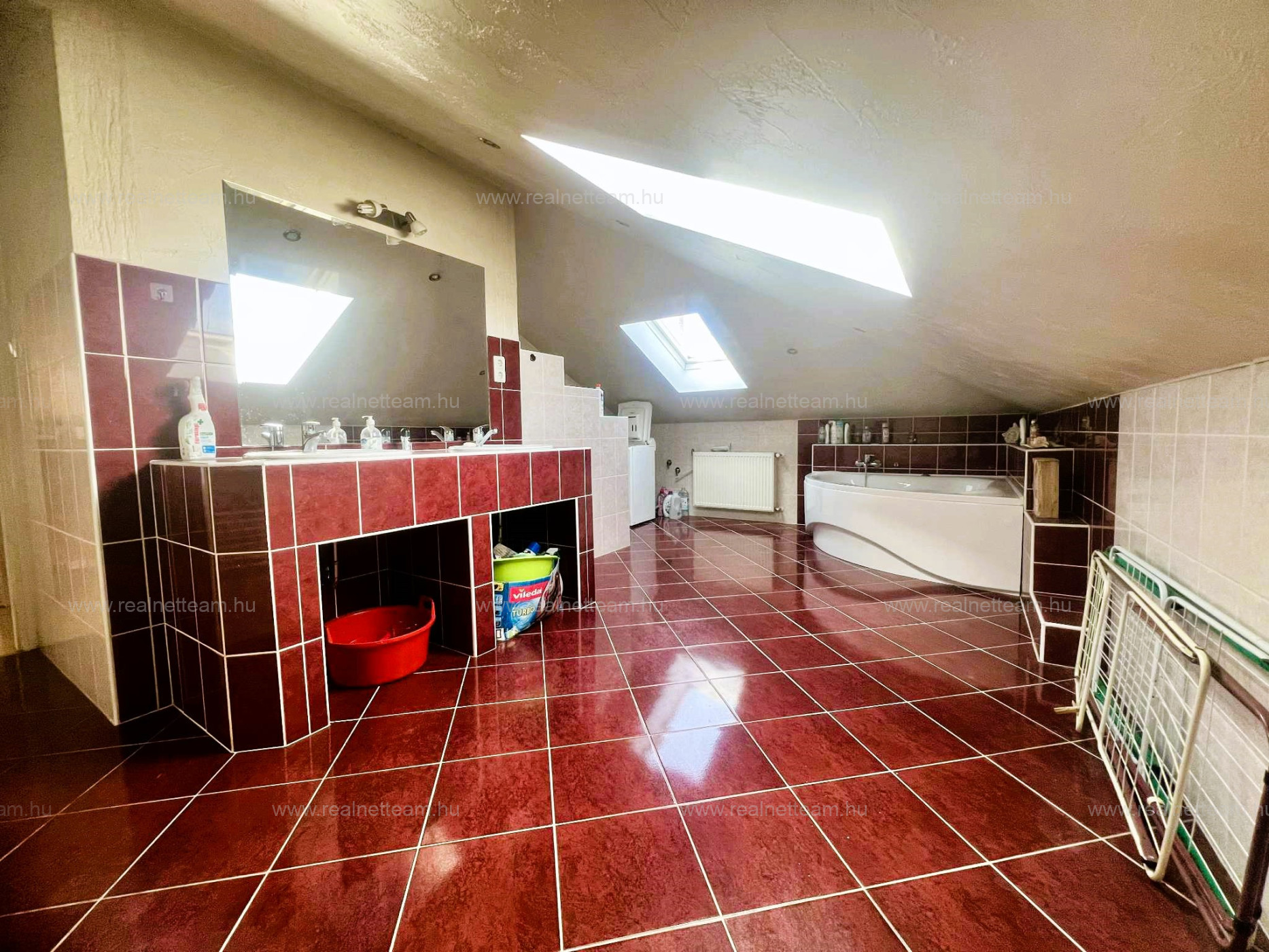 Az emeletre egy fa lépcsőn keresztül jutunk egy tágas nappaliba konyhával, innét nyílik 3 szoba gardróbbal, nagy sarokkádas fürdőszoba wc-el.