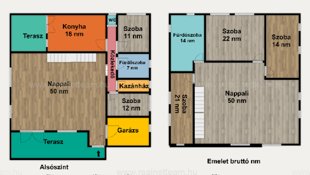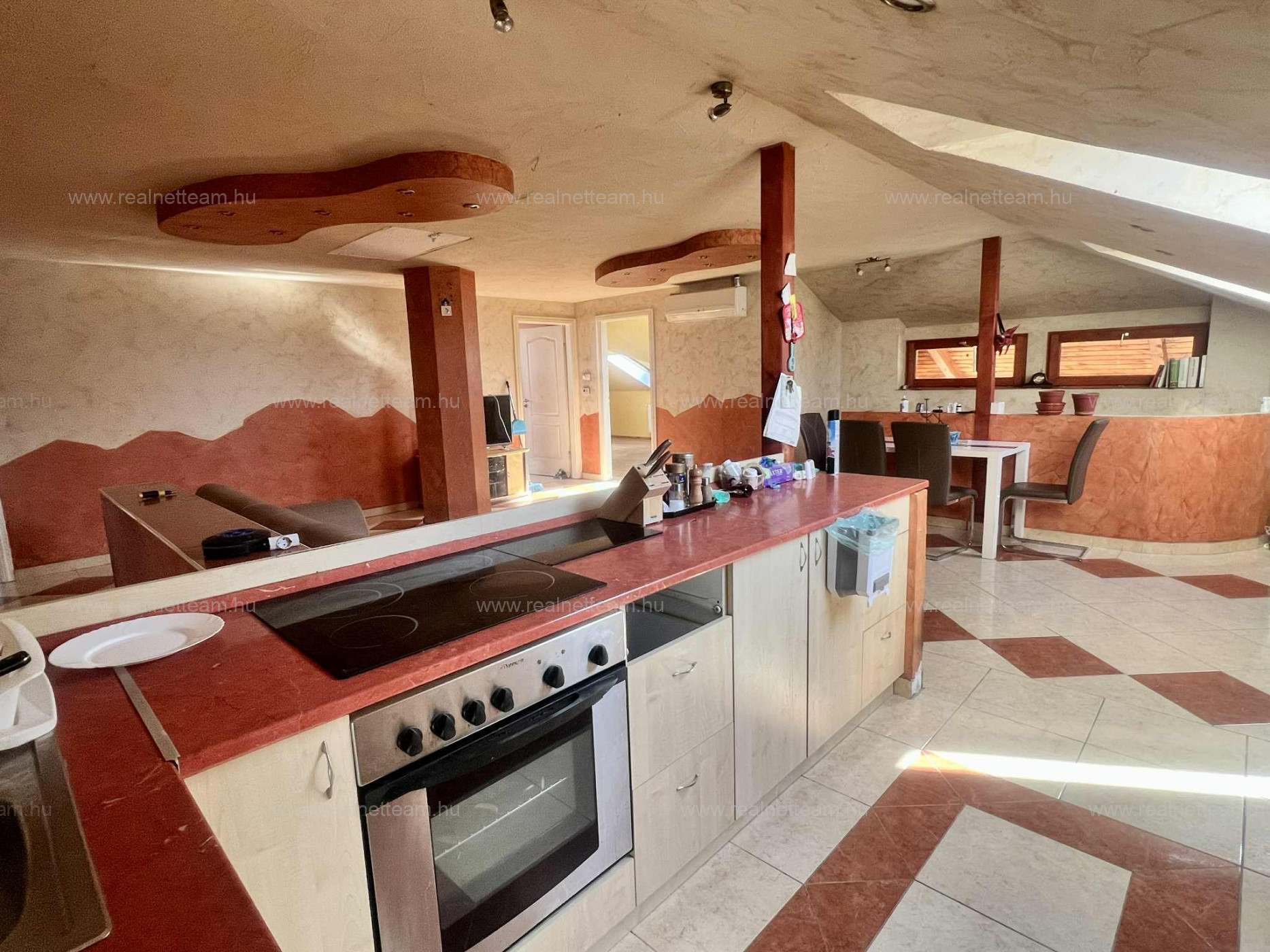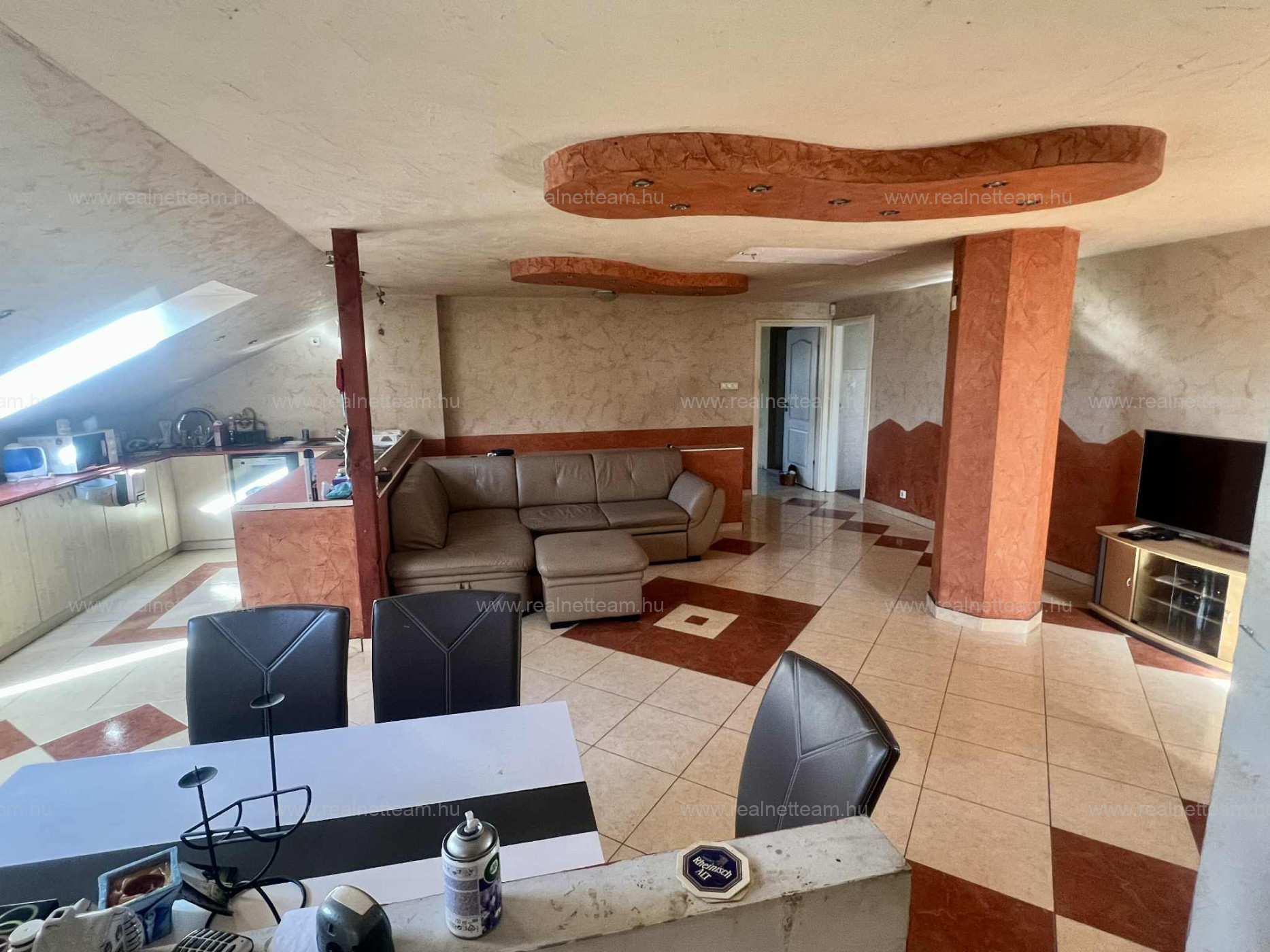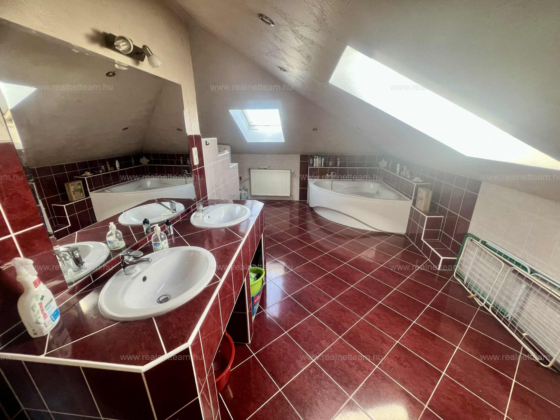Az emeletre egy fa lépcsőn keresztül jutunk egy tágas nappaliba konyhával, innét nyílik 3 szoba gardróbbal, nagy sarokkádas fürdőszoba wc-el.