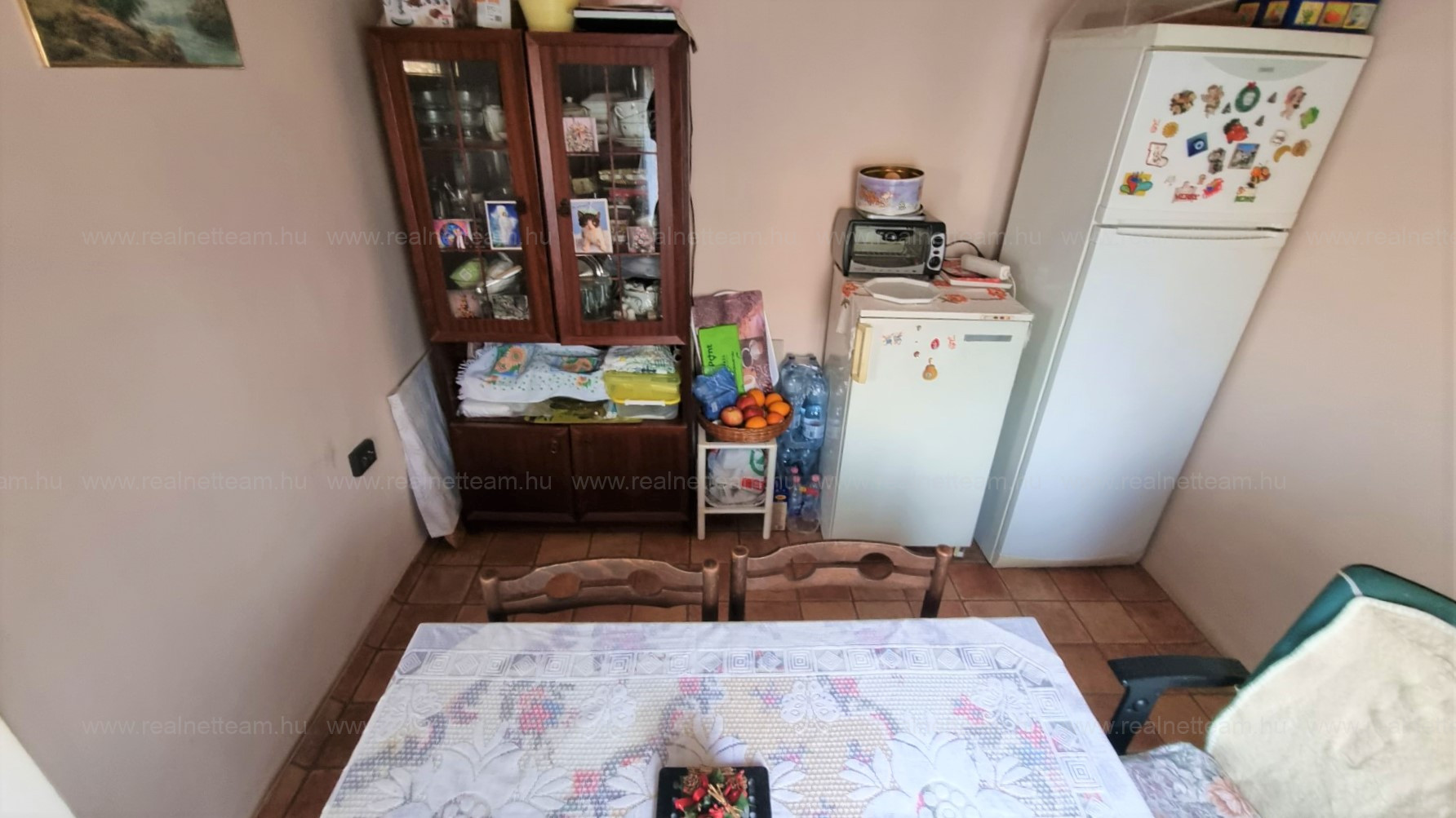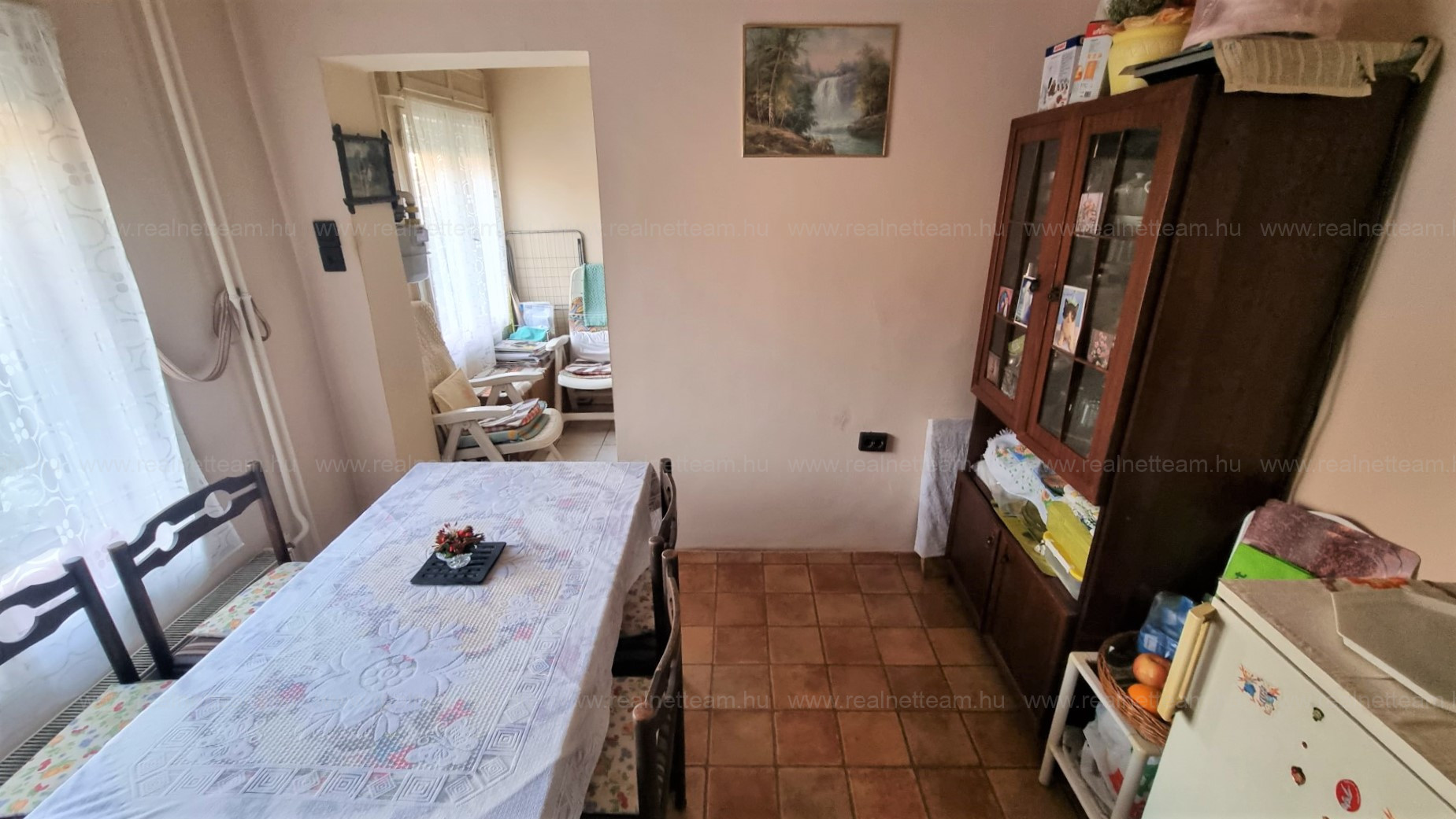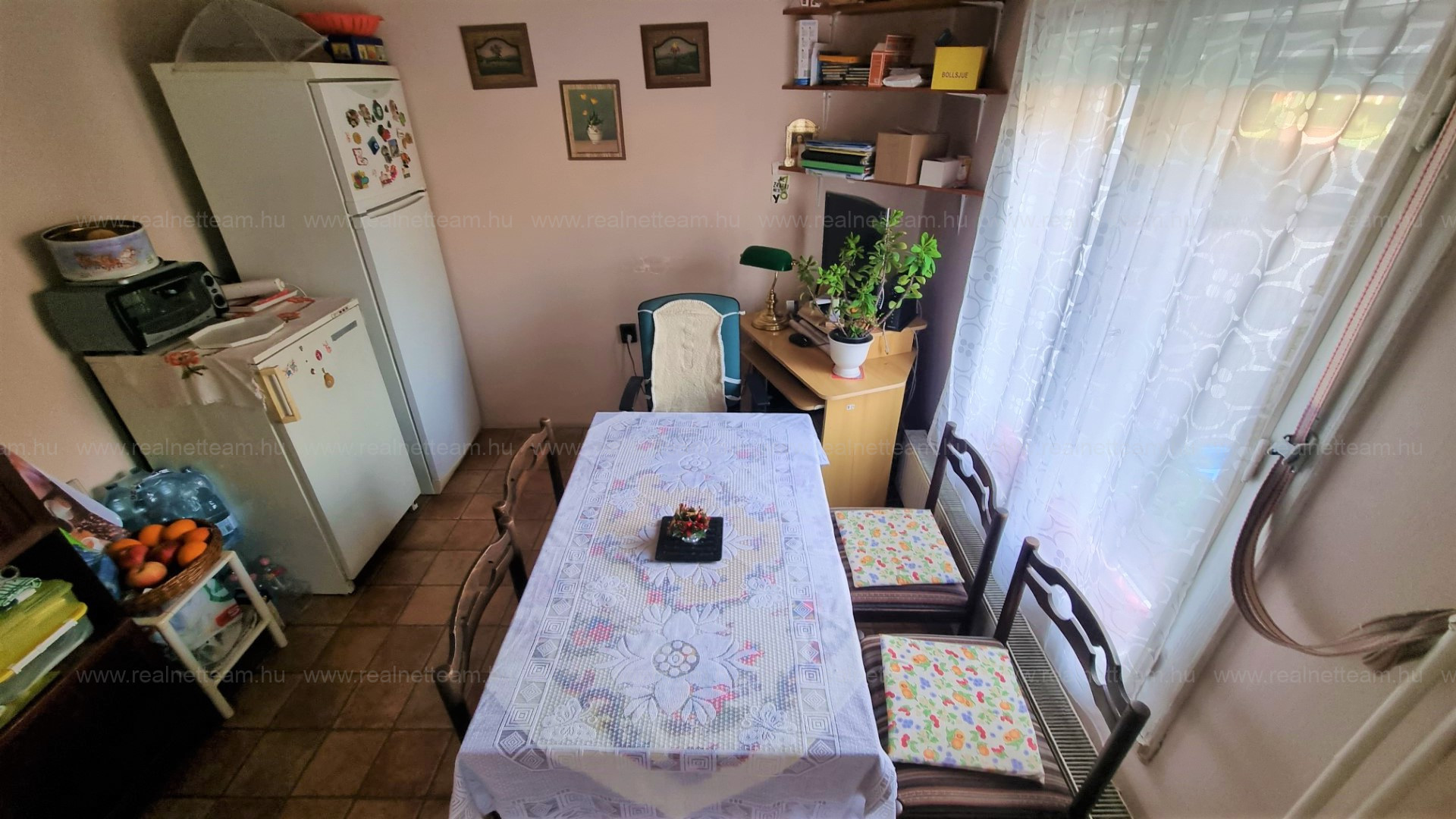 Az ingatlanba az utcáról előkerten keresztül külön bejáraton jutunk be, ahonnan az előtérrel egybenyitott konyhába érkezünk. Jobbra található a félszoba, amit jelenleg étkezőnek használnak.