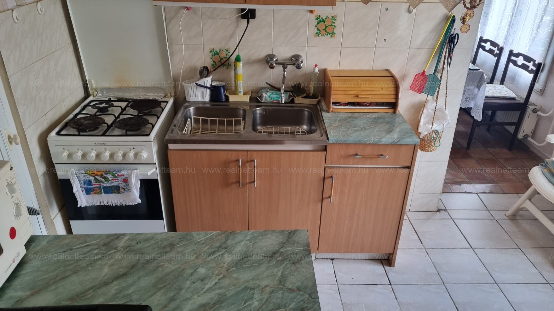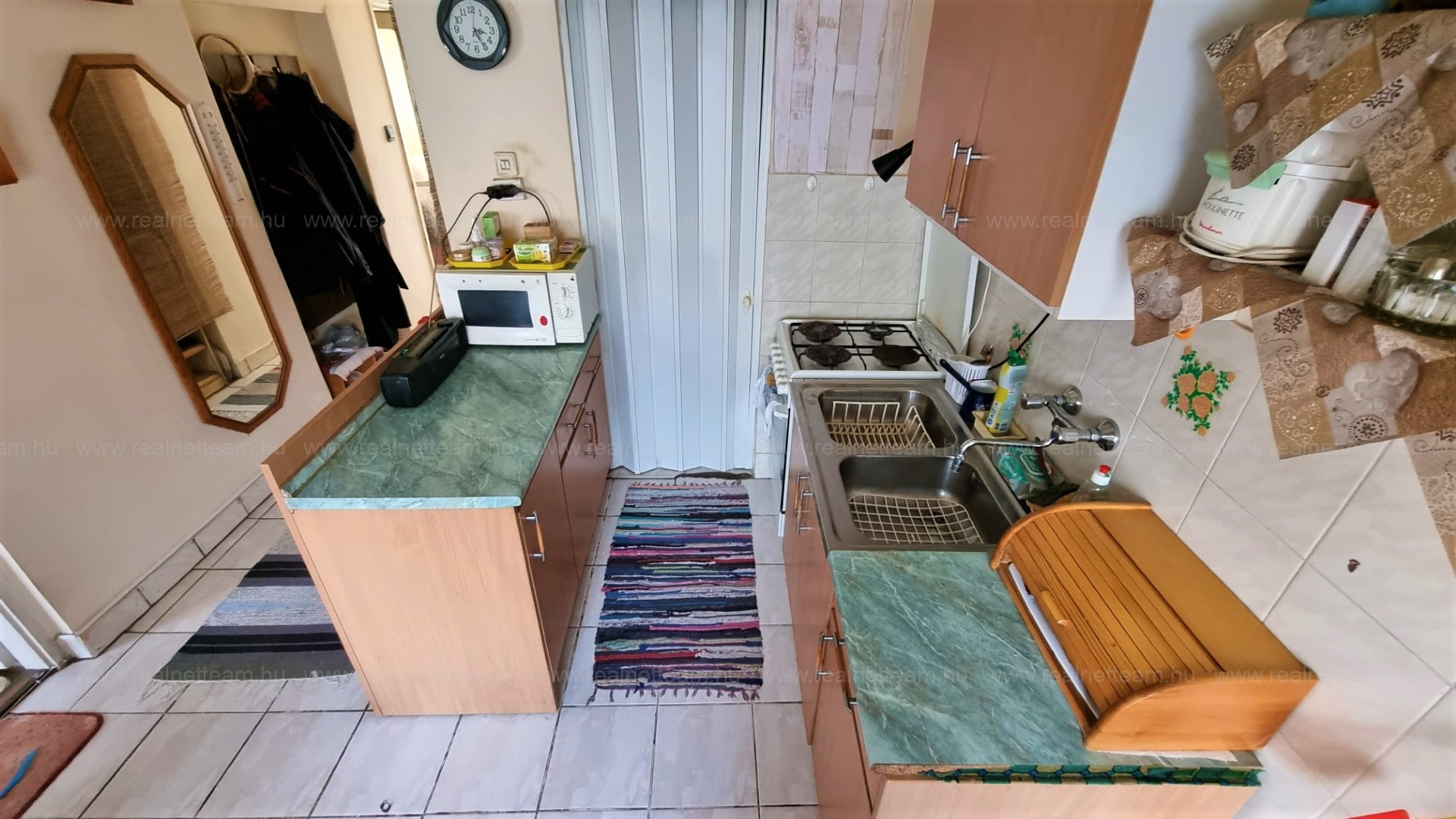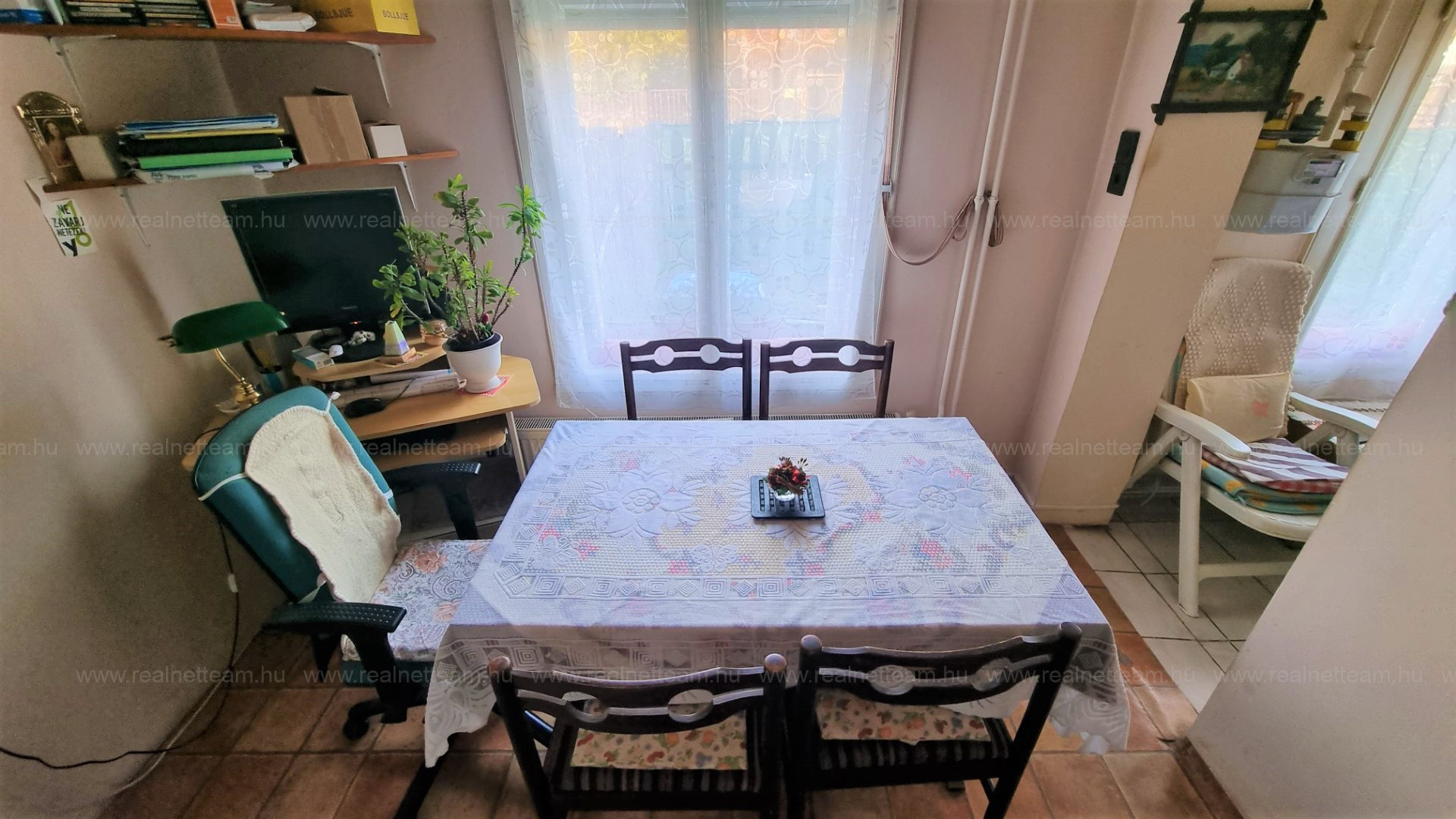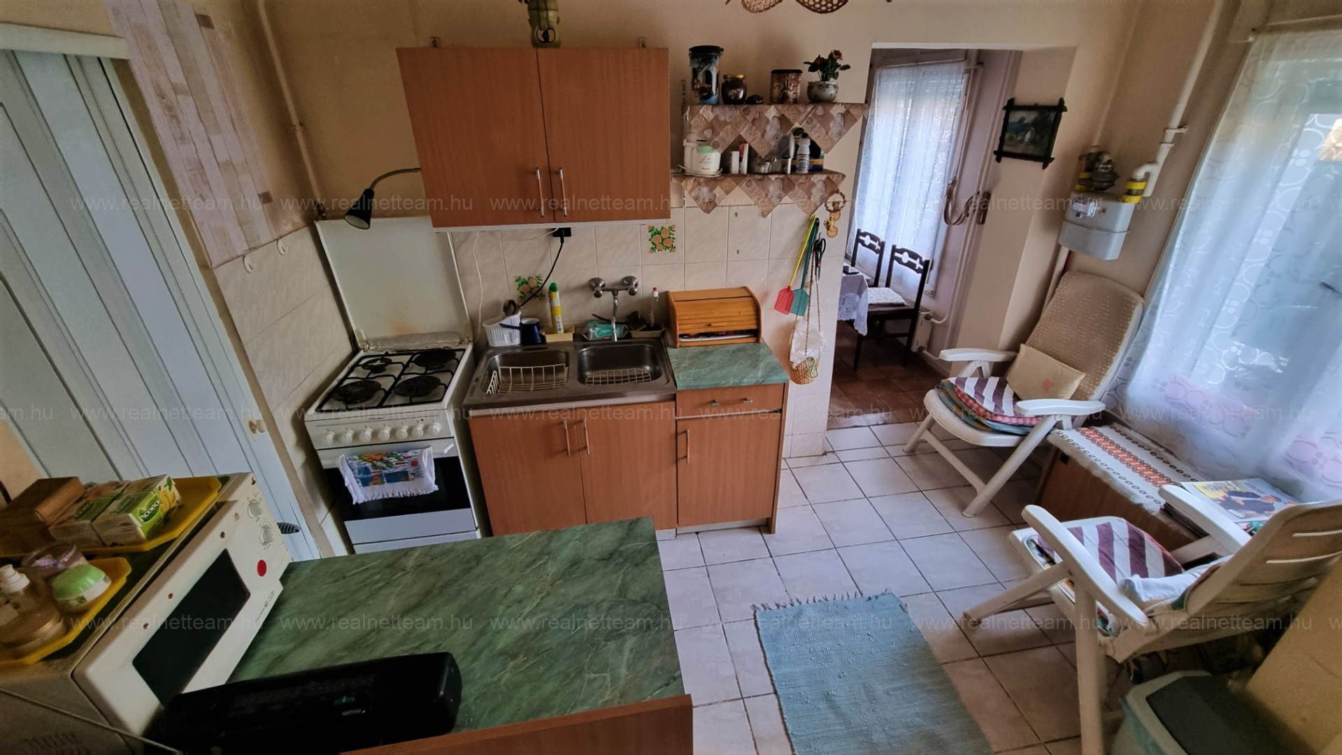 Az ingatlanba az utcáról előkerten keresztül külön bejáraton jutunk be, ahonnan az előtérrel egybenyitott konyhába érkezünk. Jobbra található a félszoba, amit jelenleg étkezőnek használnak.