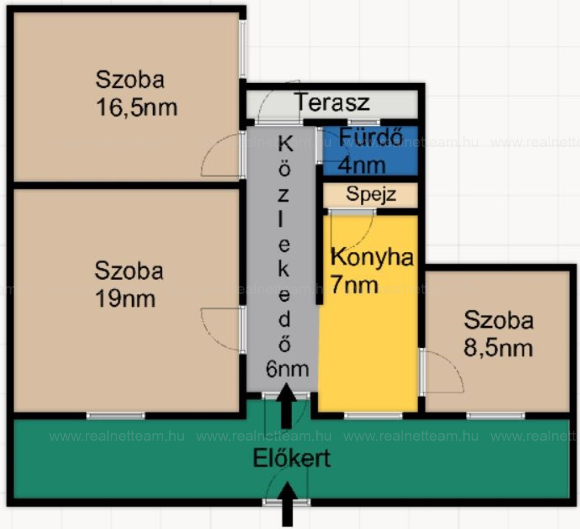 Balra fordulva érkezünk meg a nappaliba a folyosón továbbhaladva pedig a másik nagyszobába, mellyel szemben a kádas fürdőszoba helyezkedik el. A folyosó végén található a kijárat a hátsó teraszhoz (9 nm), a kertrészhez (25 nm).és a fészerhez (7 nm).
