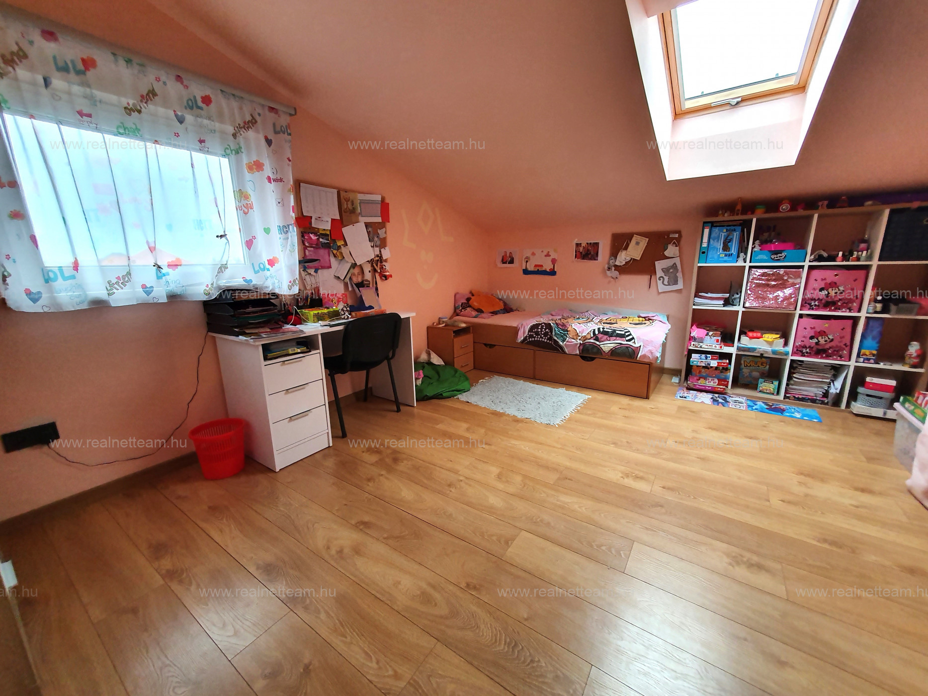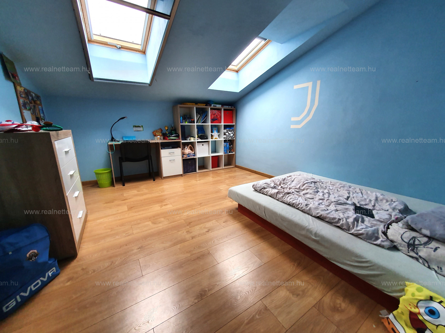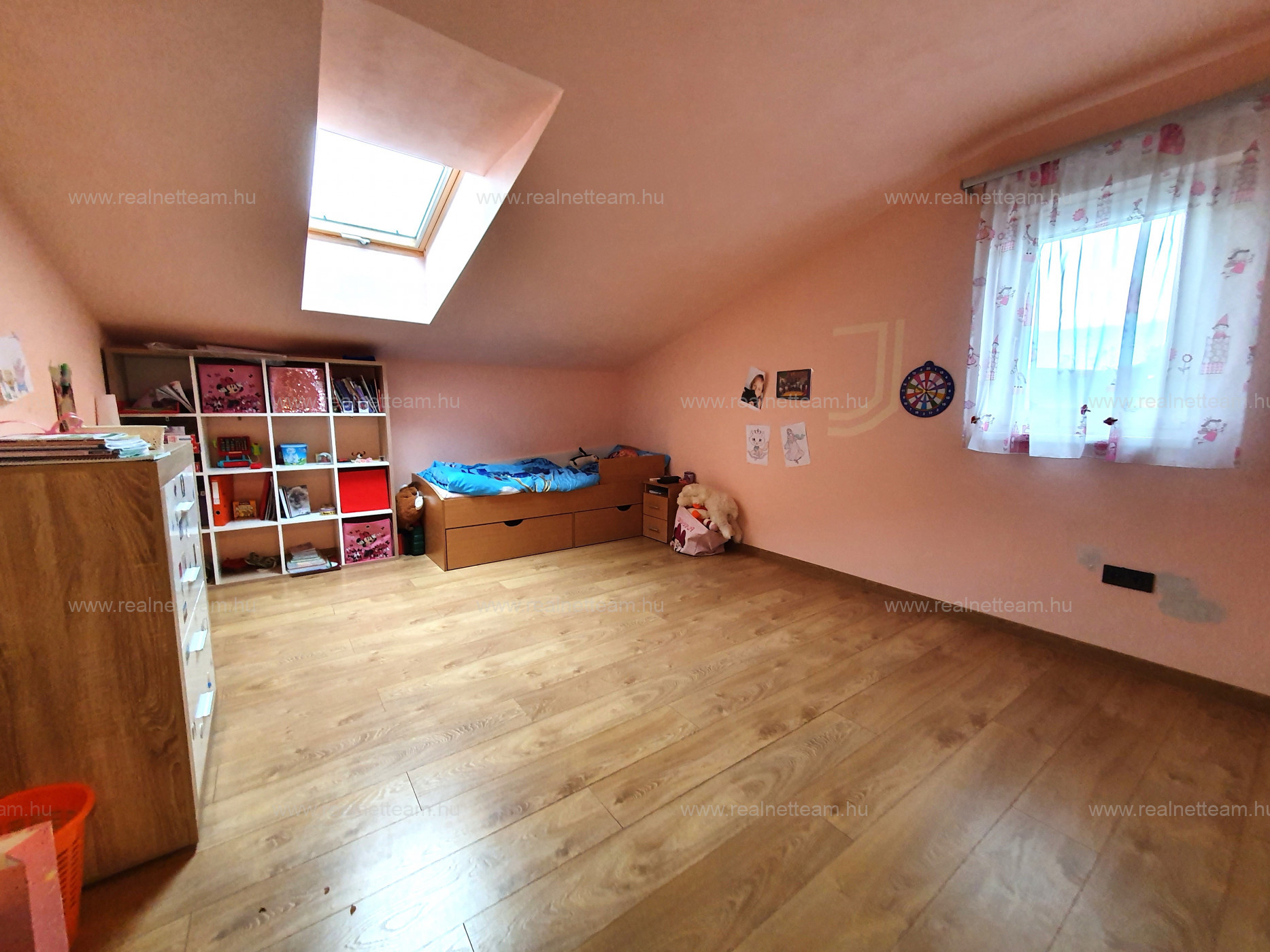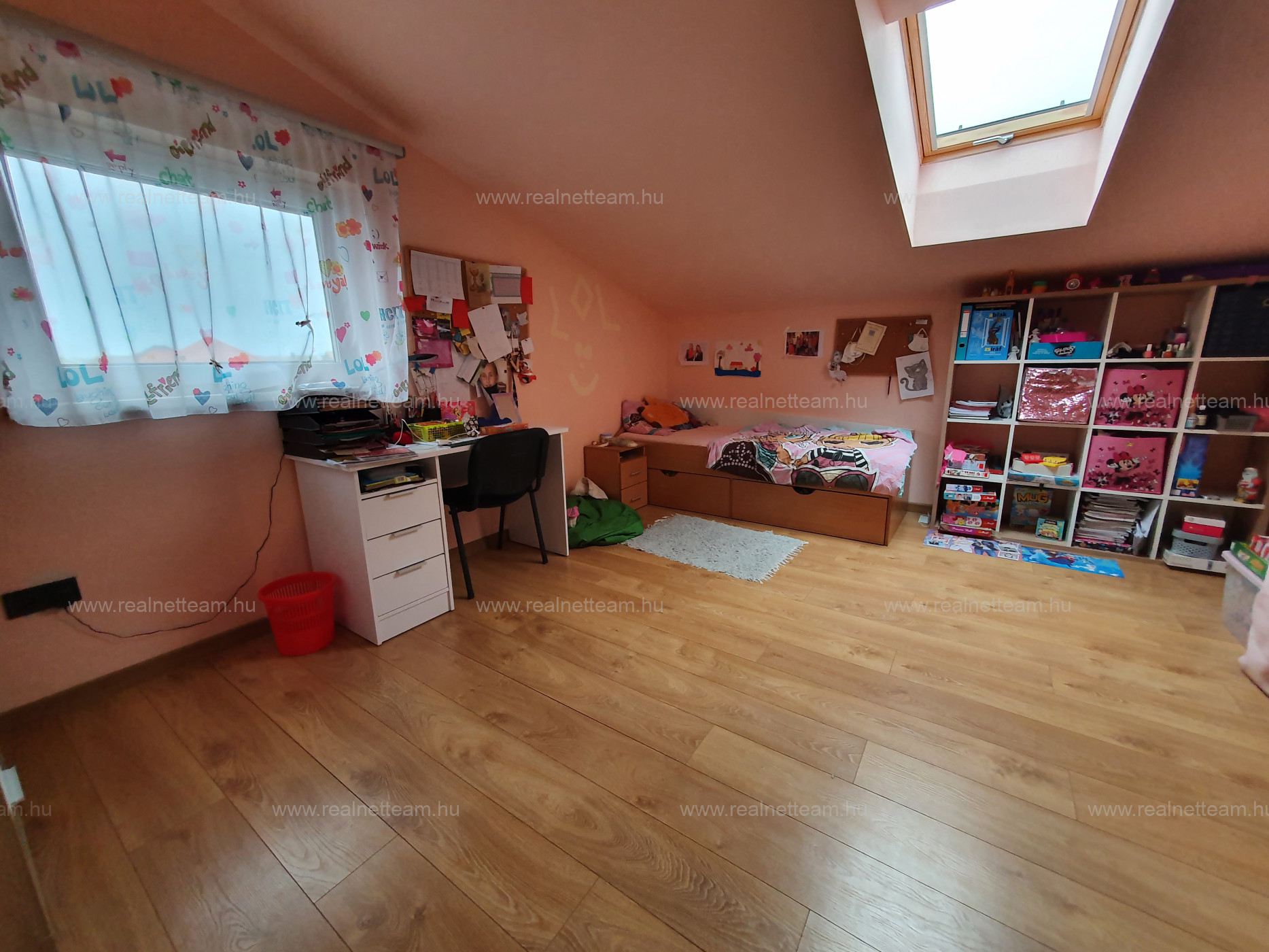 A tetőtérben 3 hálószoba, fürdőszoba WC-vel, és egy gardrób található. A burkolatok: laminált parketta és vízálló laminált parketta. A konyhabútor főzőlappal, sütővel, mikróval, a fürdőszobabútor és a lámpatestek, függönyök, karnisok a vételár részét képezik. A felső szinten hővédő rolók vannak.
