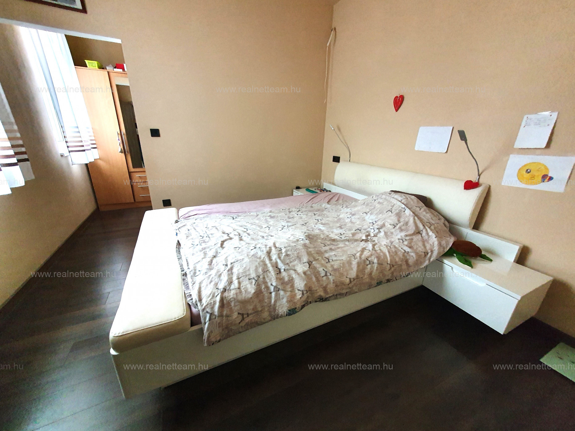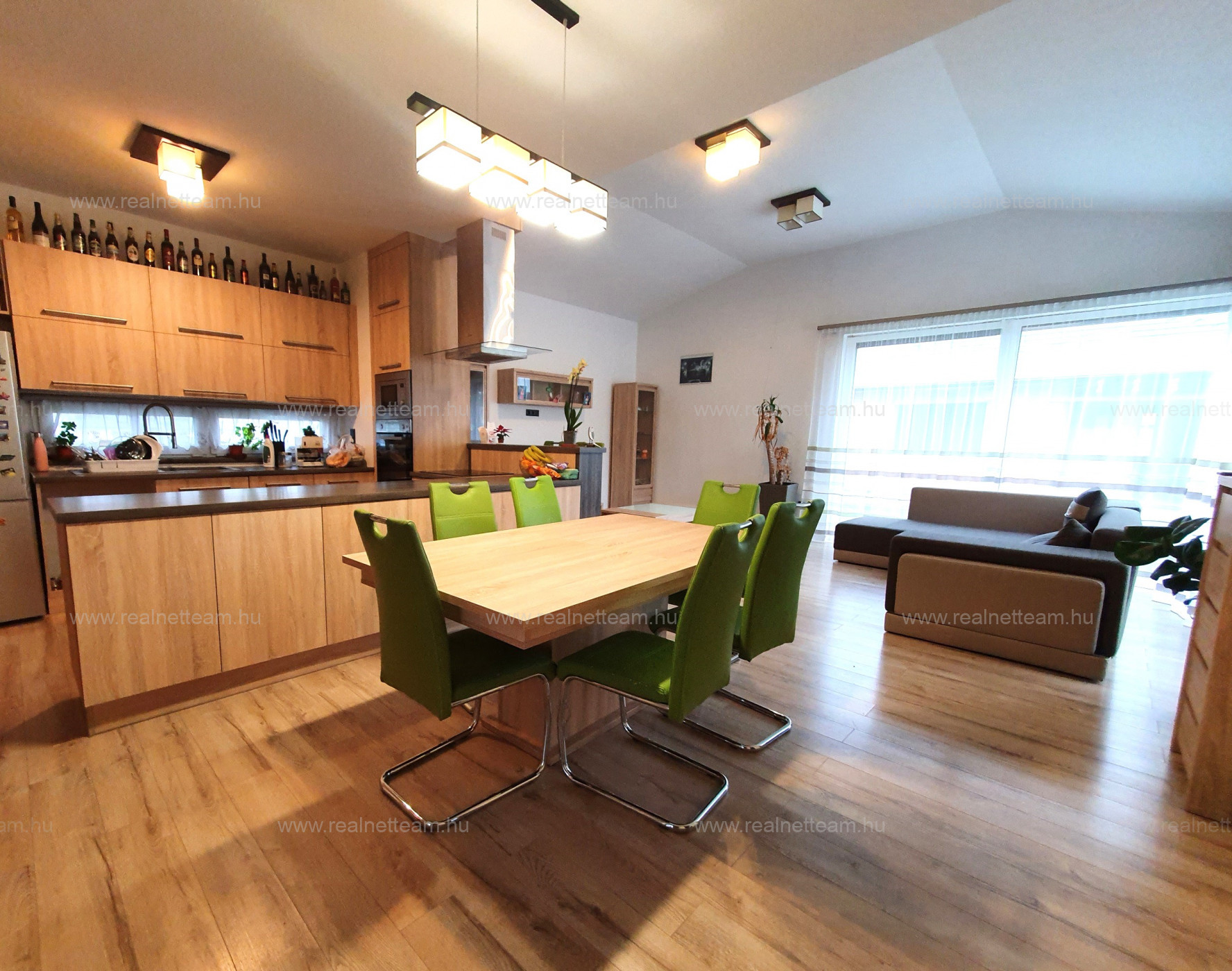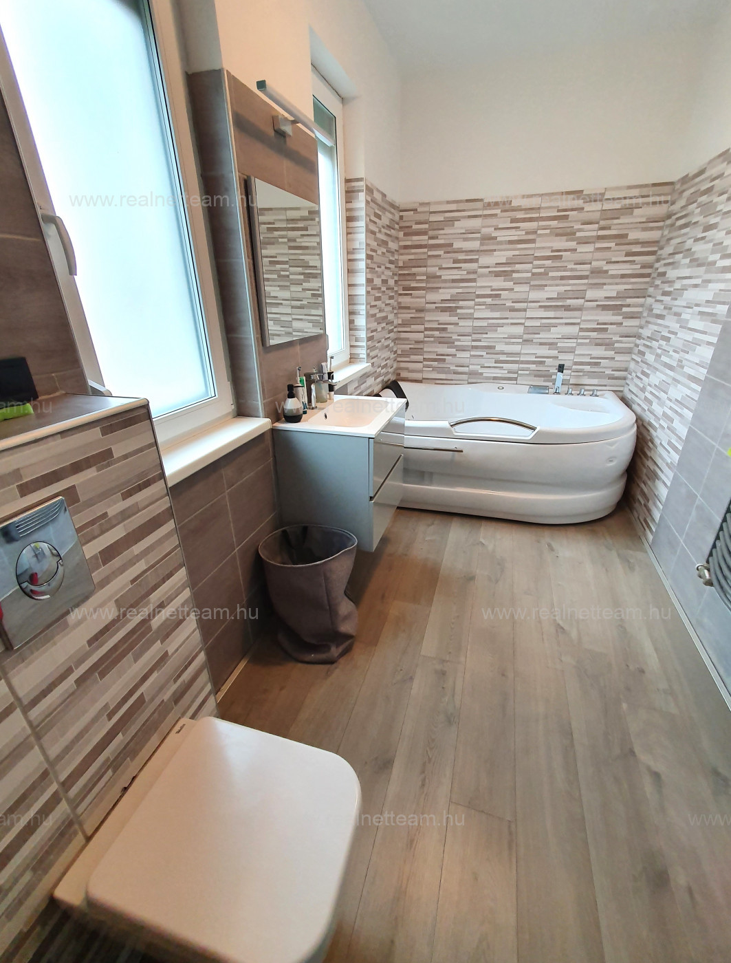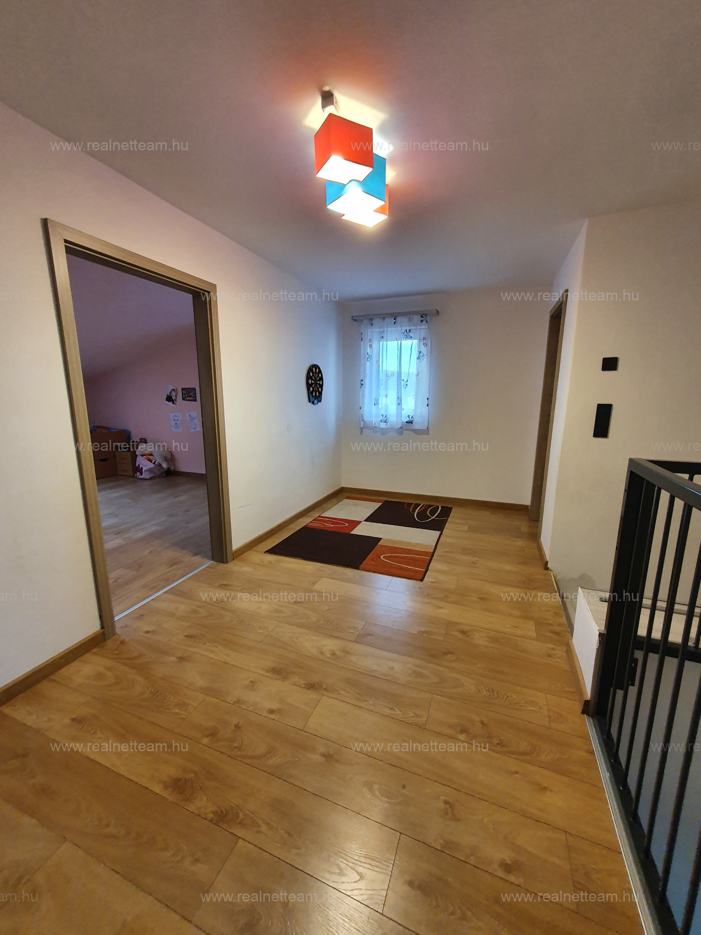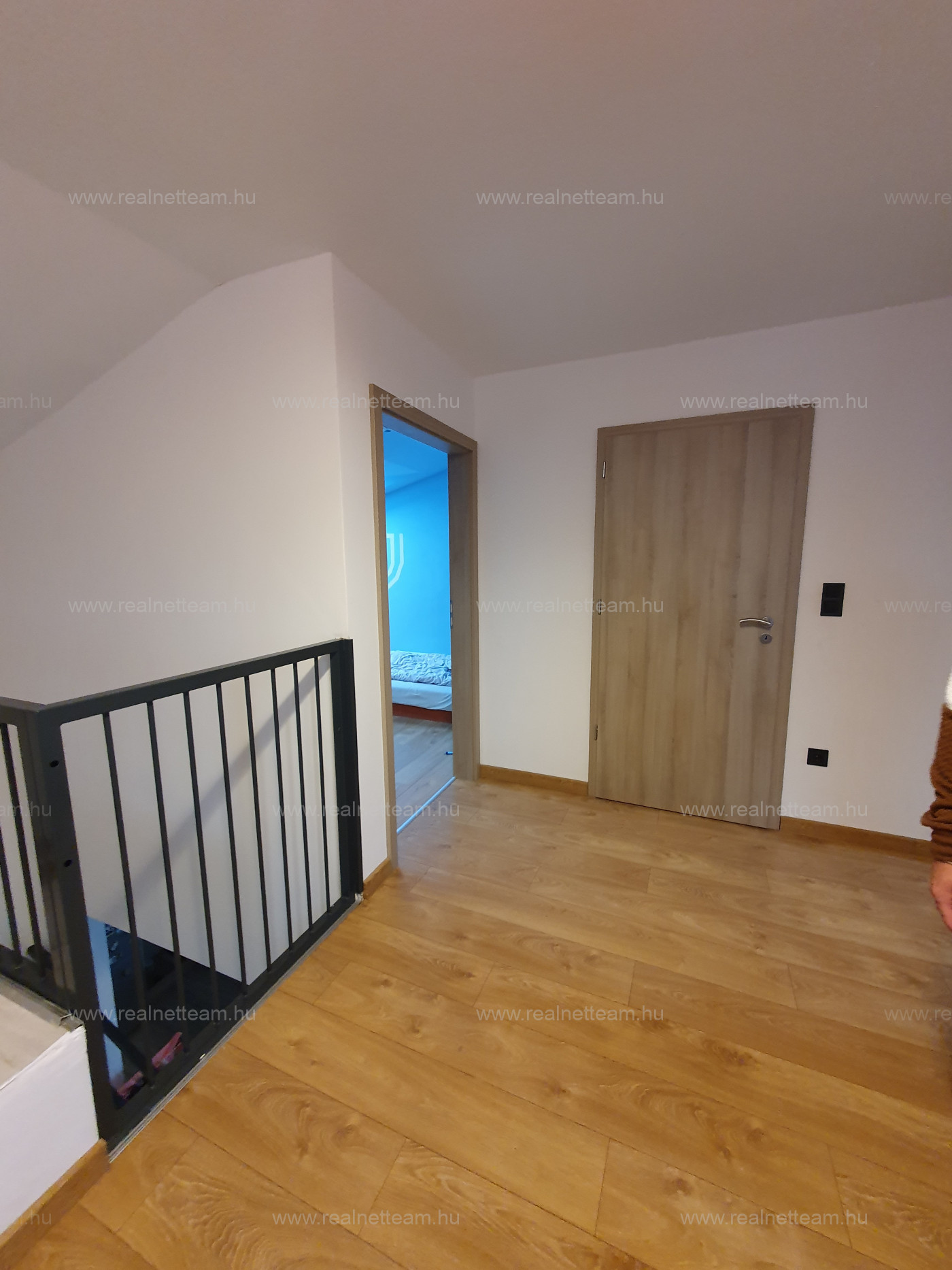 A tetőtérben 3 hálószoba, fürdőszoba WC-vel, és egy gardrób található. A burkolatok: laminált parketta és vízálló laminált parketta. A konyhabútor főzőlappal, sütővel, mikróval, a fürdőszobabútor és a lámpatestek, függönyök, karnisok a vételár részét képezik. A felső szinten hővédő rolók vannak.