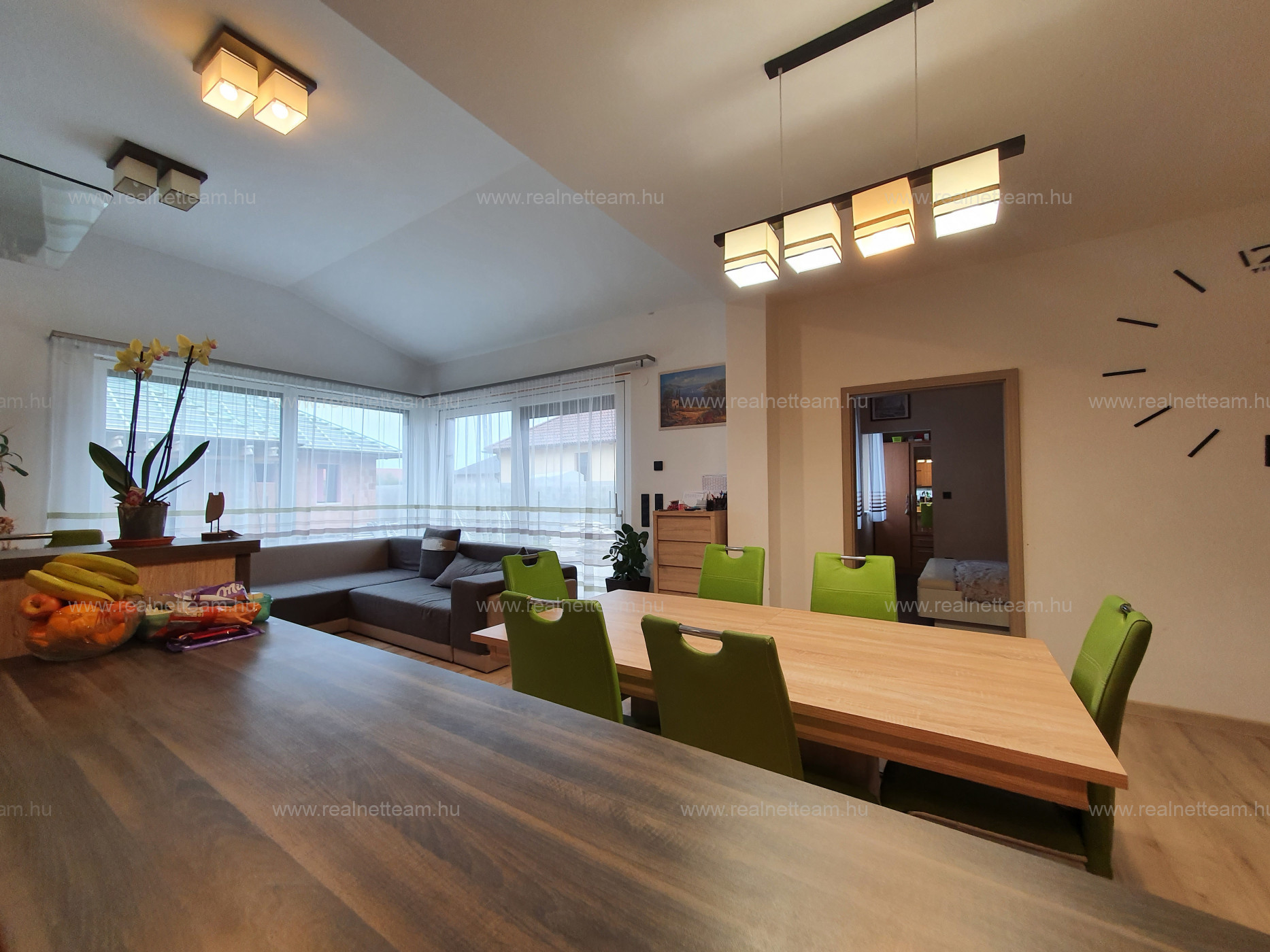 A ház jól átgondolt tervek alapján 2019-ben megvalósított otthon tágas, de élhető terekkel nagyobb család számára ideális, de mivel mindkét szinten van fürdőszoba és hálószoba is két generáció összeköltözésre is alkalmas, illetve a bejárat közeli szoba otthoni munkavégzésre.