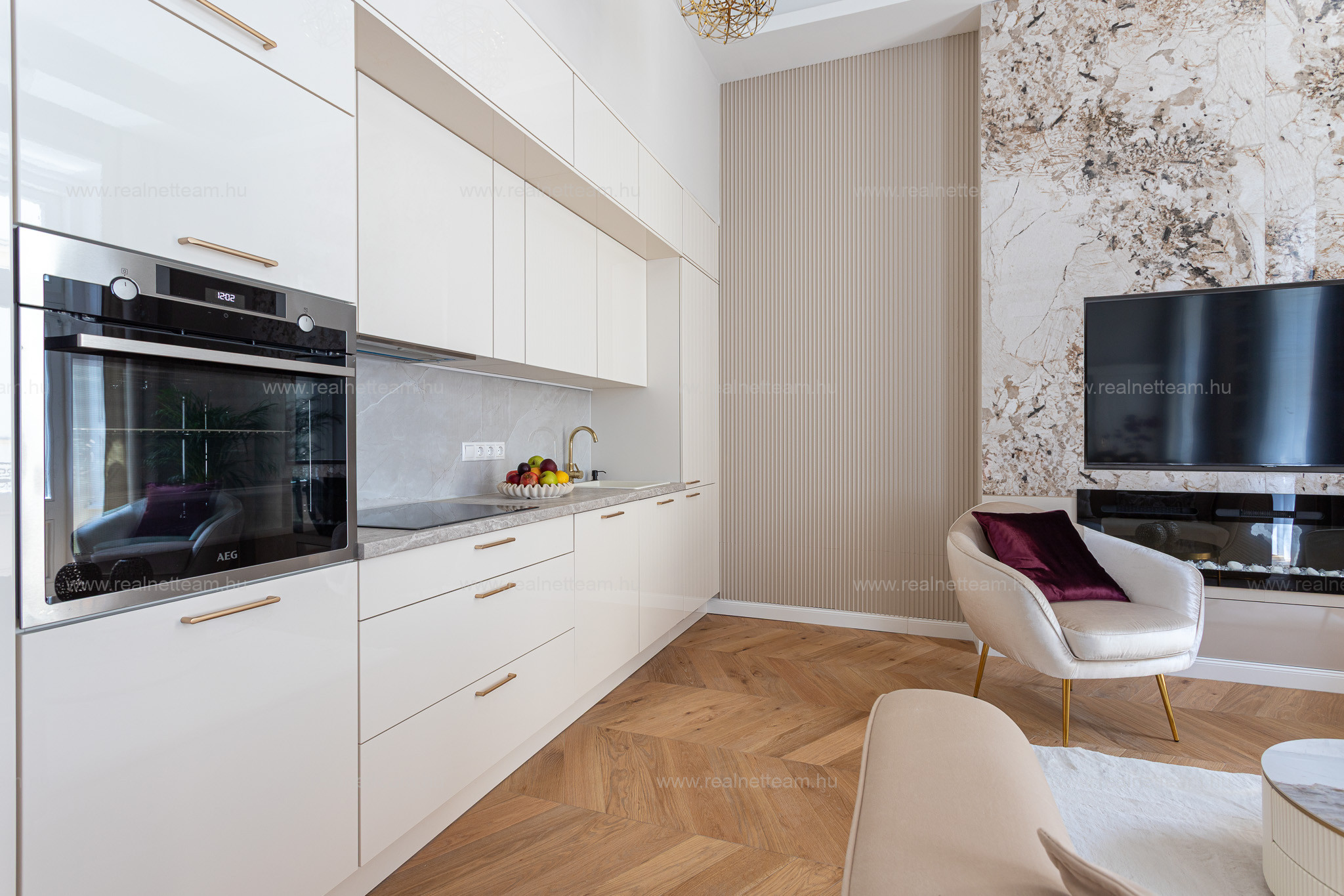 * Teljesen gépesített AEG konyha: mosogatógép, hűtő fagyasztóval, sütő, főzőlap, páraelszívó, mosógép