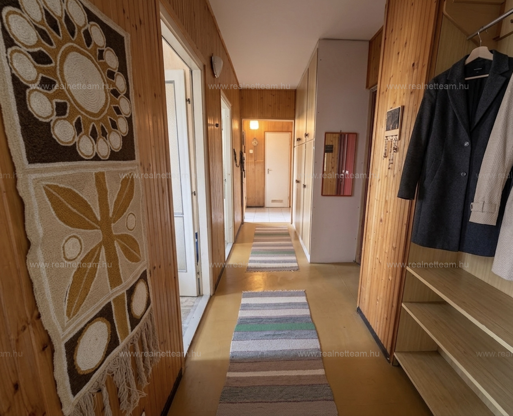 Több helyiségben lambériás falburkolat található, amely kedvelőinek külön értéket képviselhet. A praktikus tárolást az előszobában és az egyik hálószobában található beépített szekrények segítik.